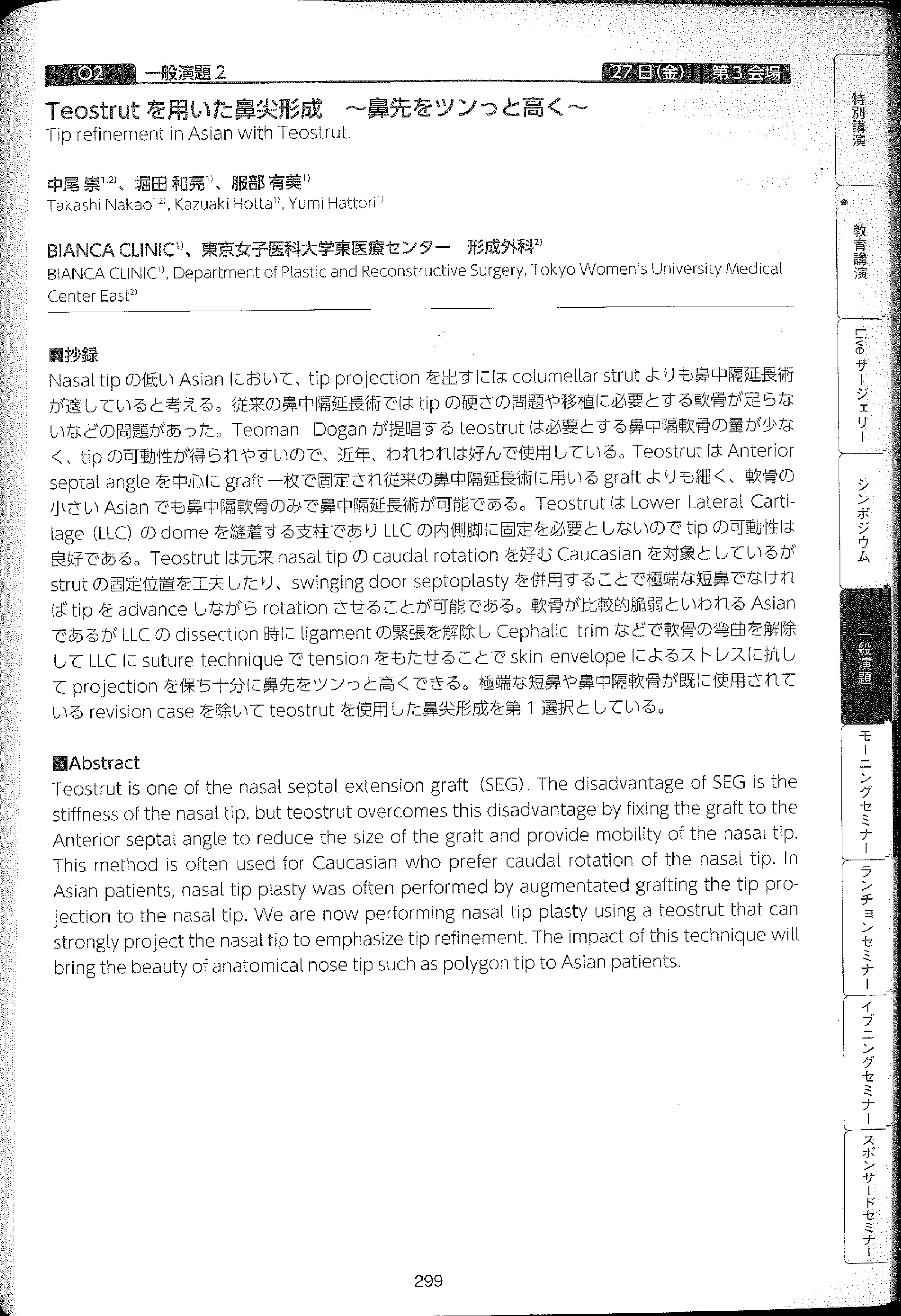 Nasaltip の低い Asian において、tip projection を出すには columellar strut よりも鼻中隔延萇術が適していると考える。従来の鼻中隔延長術では tip の硬さの問題や移植に必要とする軟骨が足らないなどの問題があった。Teoman Doganが提唱する teostrut は必要とする鼻中隔軟骨の量が少なく、tip の可動性が得られやすいので、近年、われわれは好んで使用している。Teostrut は Anteriorseptal angle を中心に graft 一枚で固定され従来の鼻中隔延長術に用いる graft よりも細く、軟骨の小さい Asian でも鼻中隔軟骨のみで鼻中隔延長術が可能である。Teostrut は Lower Lateral Carti-lage (LLC) のdome を縫着する支柱であり LLC の内側脚に固定を必要としないので tip の可動性は良好である。Teostrutは元来 nasal tip の caudal rotation を好む Caucasian を対象としているが