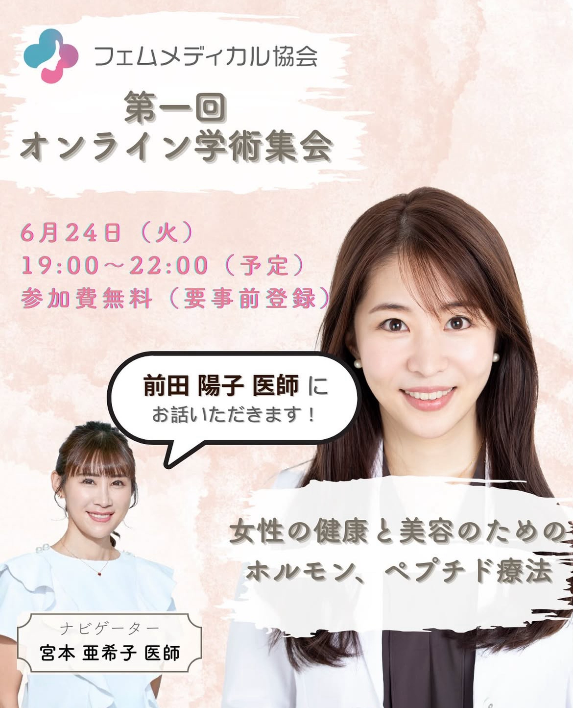 学会・セミナー実績 2025.06.24 フェムメディカル協会 第一回オンライン学術集会 美容婦人科指導医・ 日本専門医機構認定 産婦人科専門医の宮本医師と美容内科指導医の前田医師が フェムメディカル協会「第一回オンライン学術集会」に、登壇いたしました。