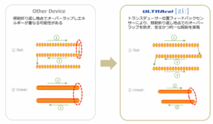 ウルトラセルZiには特殊なセンサーが搭載されていて、照射の折り返し地点でオーバーラップ(重なり)することを防ぎ、同じ位置に熱エネルギーが照射されないように設計されています。従来機では照射の折り返し地点でエネルギーがオーバーラップする可能性がありましたが、ウルトラセルZiは安全に配慮した均一な照射を実現。ドットモードとリニアモードどちらの照射でもエネルギーのオーバーラップを防ぐため、やけどのリスクも少なくなっております。