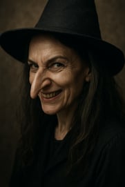魔女鼻とは鼻先が垂れた鼻のことで、意地悪、何か物を言いたげな印象になります。