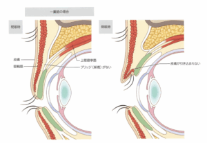 まぶたを持ち上げる筋肉(眼瞼挙筋)に繋がる挙筋腱膜から皮膚へと伸びる結合があると、まぶたを開いたときに皮膚が内側に引き込まれます。