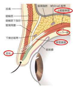 まぶたの内部には「瞼板(けんばん)」という、軟骨のような硬い組織があります。これを上から引き上げているのが「眼瞼挙筋(がんけんきょきん)」という筋肉です。