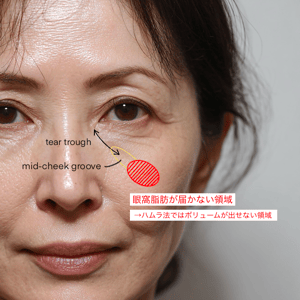 前回のブログでも触れたように、ハムラ法で移動できる脂肪は tear trough から8〜10mm程度までです。