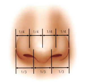 理想的とされるのは、小鼻の幅が両目の目頭(内眼角)の距離とほぼ同じであること。