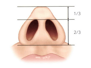 鼻の長さ(鼻長)は、ナジオン(鼻の付け根)から鼻下点によって決まり、解剖学的には顔面中央1/3を占めます。