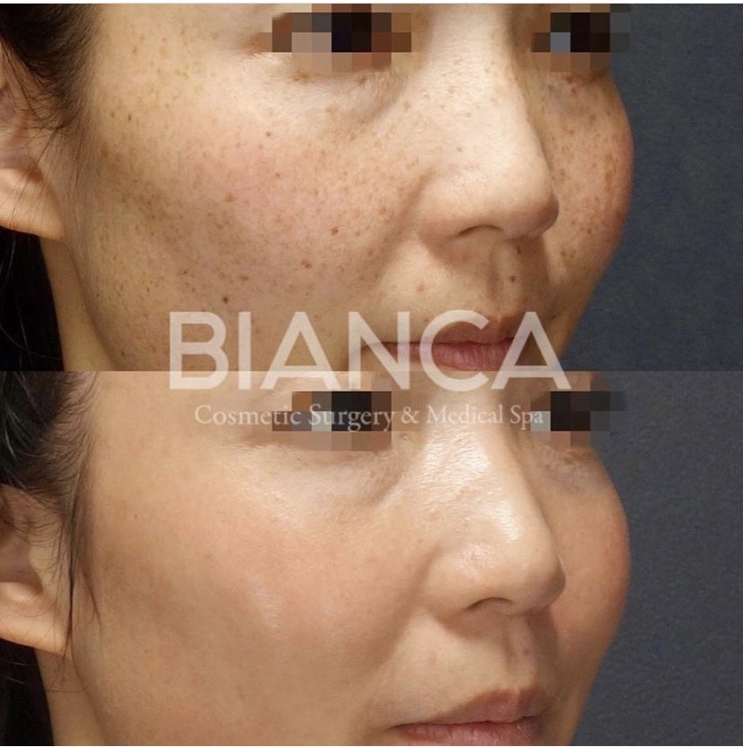 シミに対して直接ピコレーザーを照射します。シミ・ソバカス・ADMなどを改善できます。照射後、1週間後にかさぶたとなって徐々に剥がれ落ちます✨顔にできるシミにはいくつか種類があるため、医師の診察の上で施術が適応かを診させていただきます✨