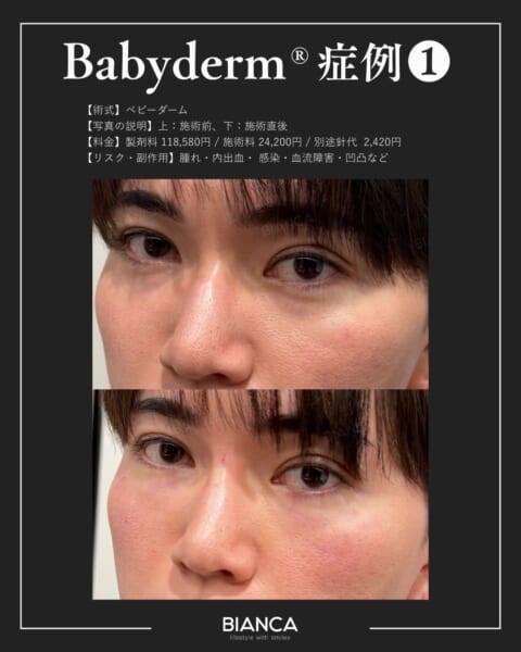 ヒアルロン酸が「形を作る」施術であるのに対し、ベビーダームは「質感を整える」施術とされています。