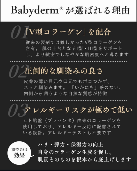 安全性: ヒト由来の成分であるため、動物由来のコラーゲン製剤と比較してアレルギー反応のリスクが低く、通常パッチテストは不要です。