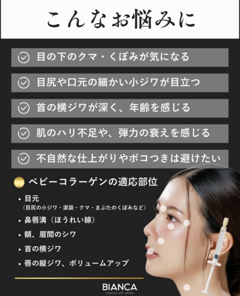肌のハリや弾力、小じわの改善を目的とした注入治療(いわゆる「ベビーコラーゲン注射」)に使用されます。