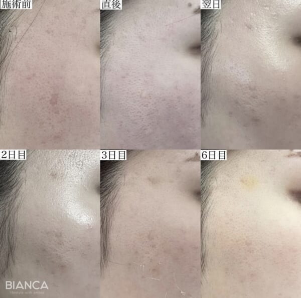 現在約1週間程経ちました。ダウンタイムはほぼなく、毛穴が少し小さくなった+小皺が薄くなった感じがします。まだこれからどんどん効果が出てくるなので期待したいです。
