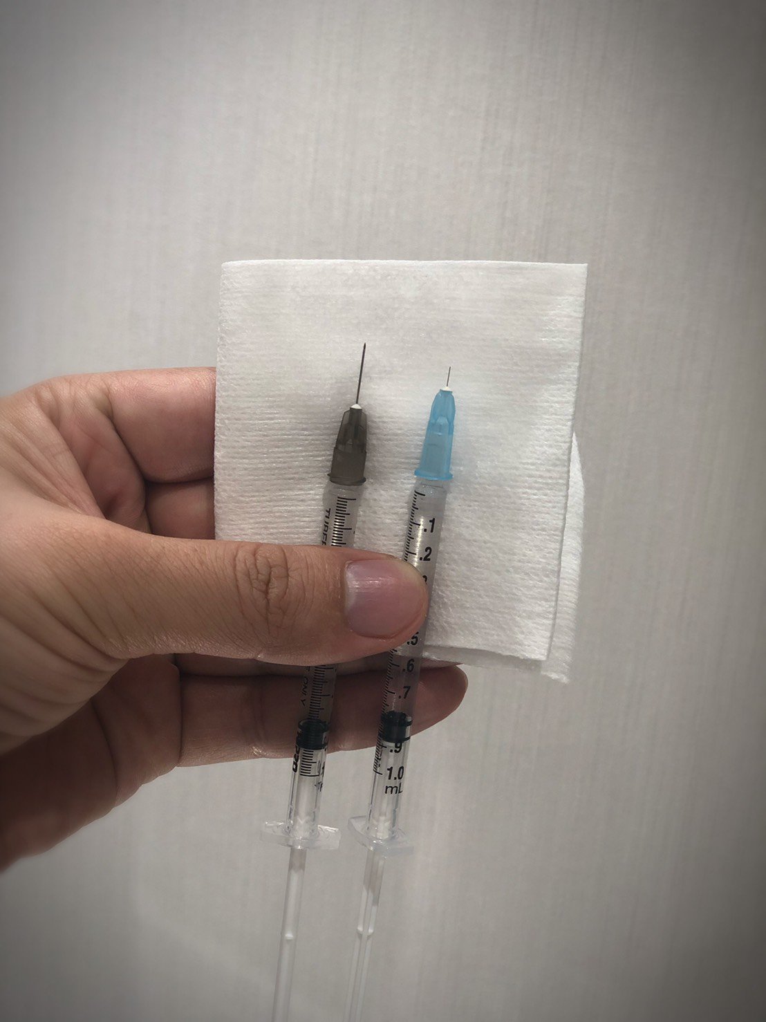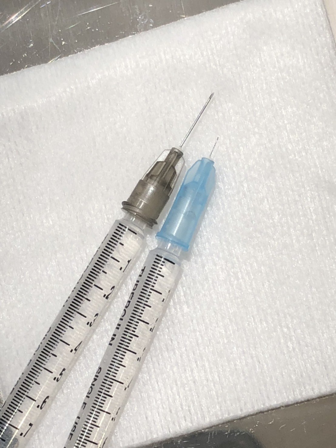 上の写真の左側がよく予防接種とかで使われる27Gの針になります。