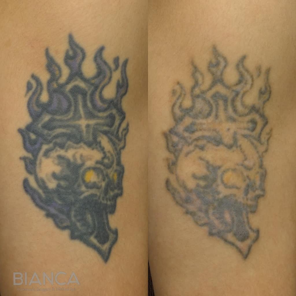 今回の症例でもよく見ると炎の中は青紫色でドクロの目は黄色でありますが、2回の治療でかなり薄くなっております。