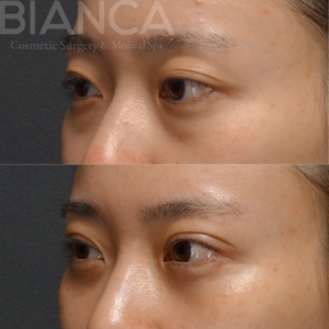 目の開きの悪さには、埋没法による眼瞼下垂修正を施し、