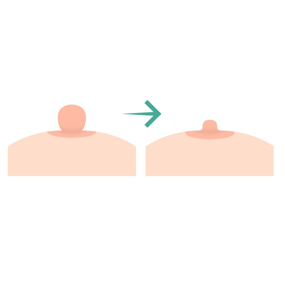 出産や授乳の影響で大きくなった乳頭の大きさを小さく整えます。 基本的に乳管は温存するので授乳に対する影響も最小限に抑え、余分な組織を取り除き、小さく縫い縮めます。乳頭周囲の傷は治りも良く、傷痕も目立ちにくい部位です。