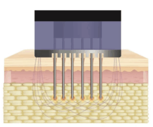 モフィウス8は24本の細い針(マイクロニードル)を皮下に刺入し、針先から強力なラジオ波を照射することで コラーゲンやエラスチンの生成を促します。それによって肌のハリ・弾力の軽減、ニキビ痕や傷痕の改善、そしてたるみの強力な引き締め効果を発揮します。