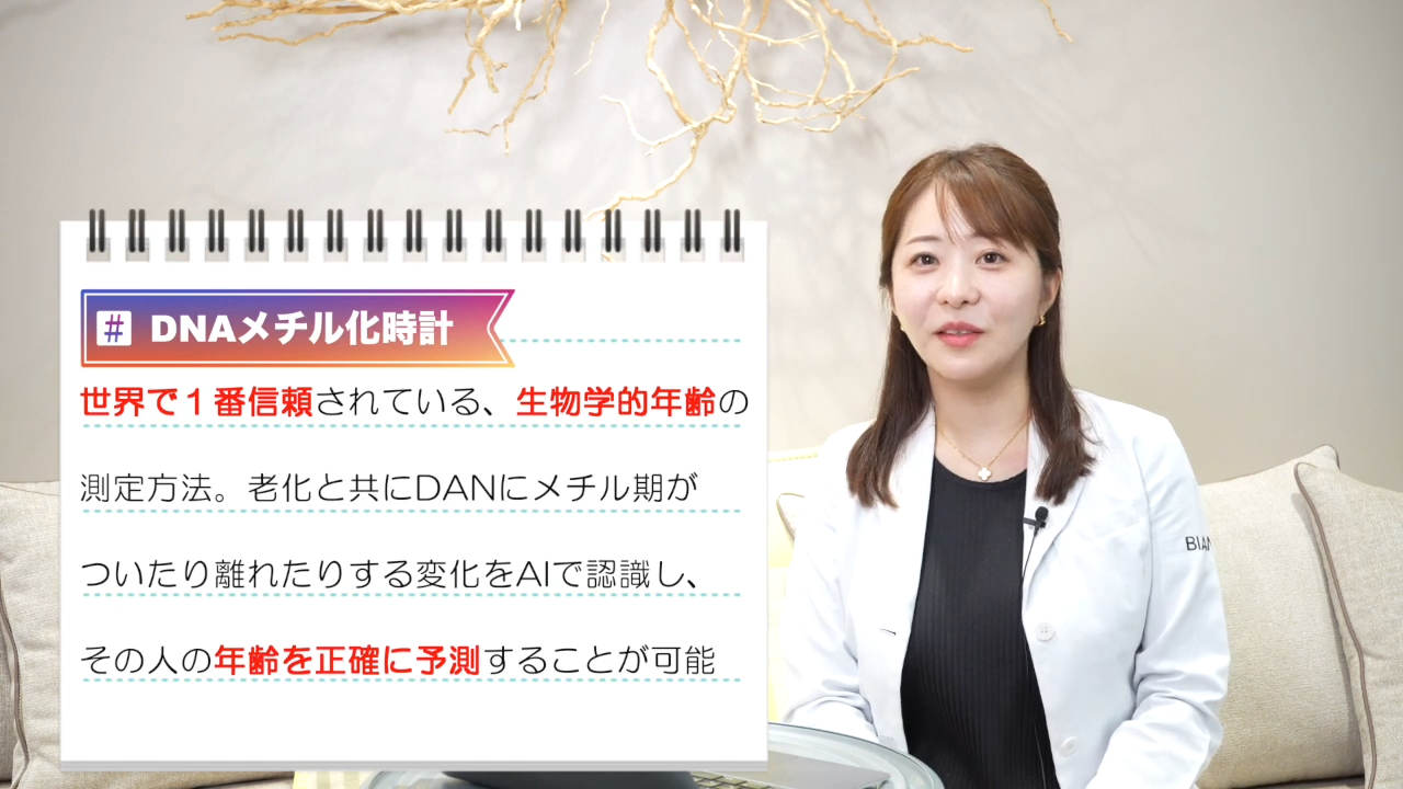 では、どうやって体内年齢を把握するのかというと、BIANCAではDNAメチル化時計という指標を採用しています。生物学的年齢にもいろいろな種類があるのですが、世界的にも科学的に信頼できると考えられている指標です。老化とともにDNAにメチル化がついたり離れたりする変化をAIで認識し、体内年齢を正確に予測できます。