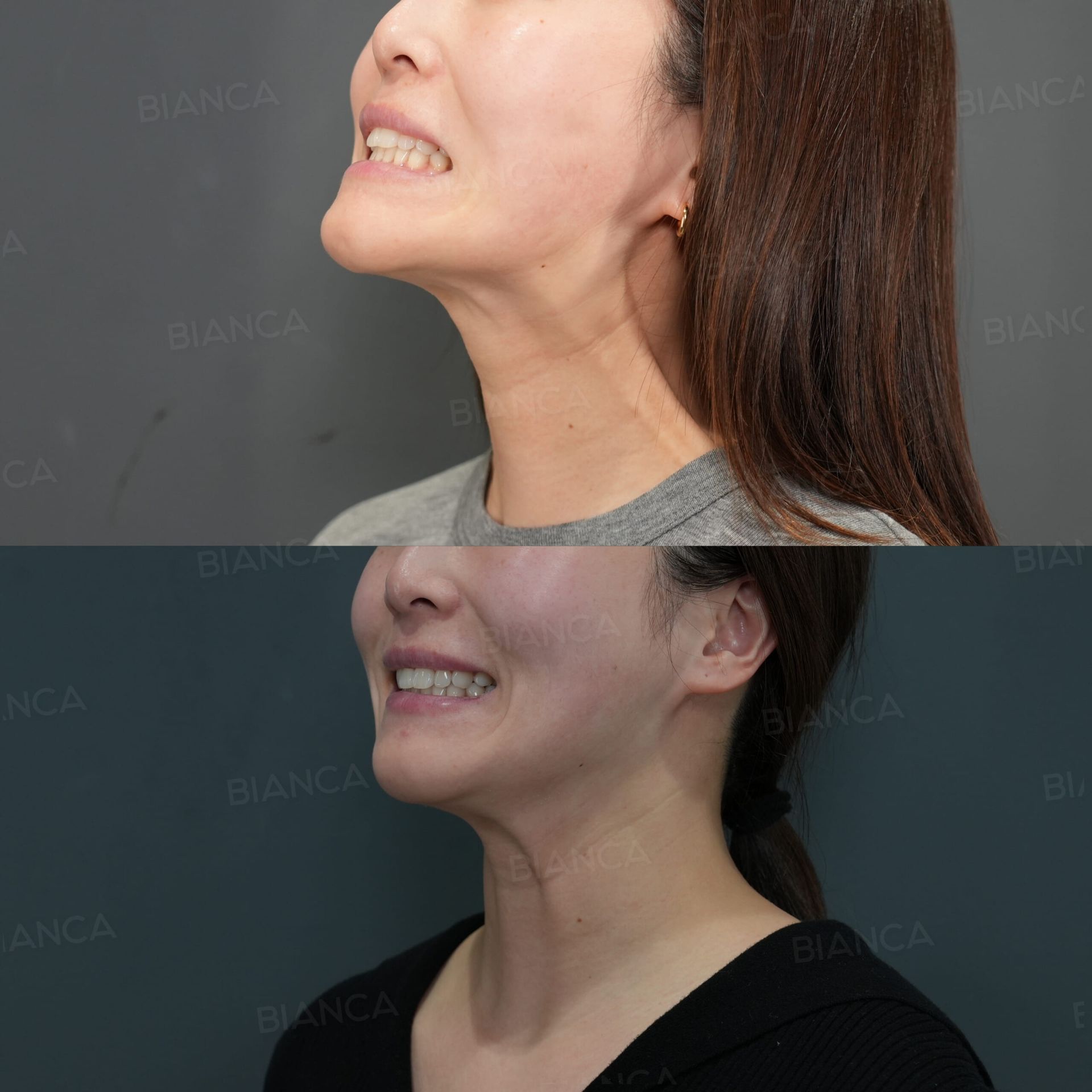 Hyaluronic acid injection (tip of nose, chin), Botox injection (gills)