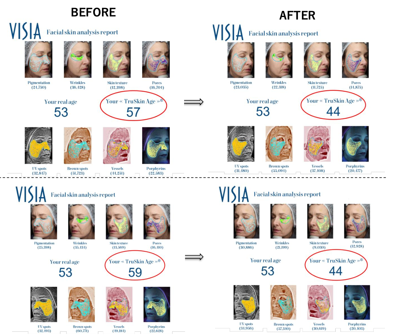 After two treatments, the skin age became 2 years on the right side of the face and 44 years on the left side, making the skin 44 to 13 years younger than before treatment.