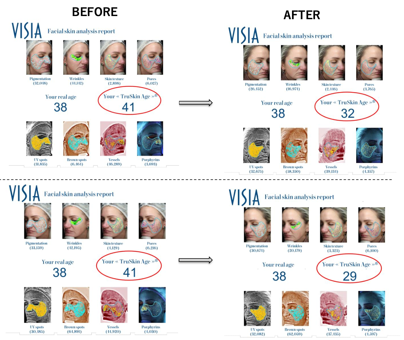 After two treatments, the skin age became 2 years on the right side of the face and 32 years on the left side, making the skin 29 to 6 years younger than before treatment.