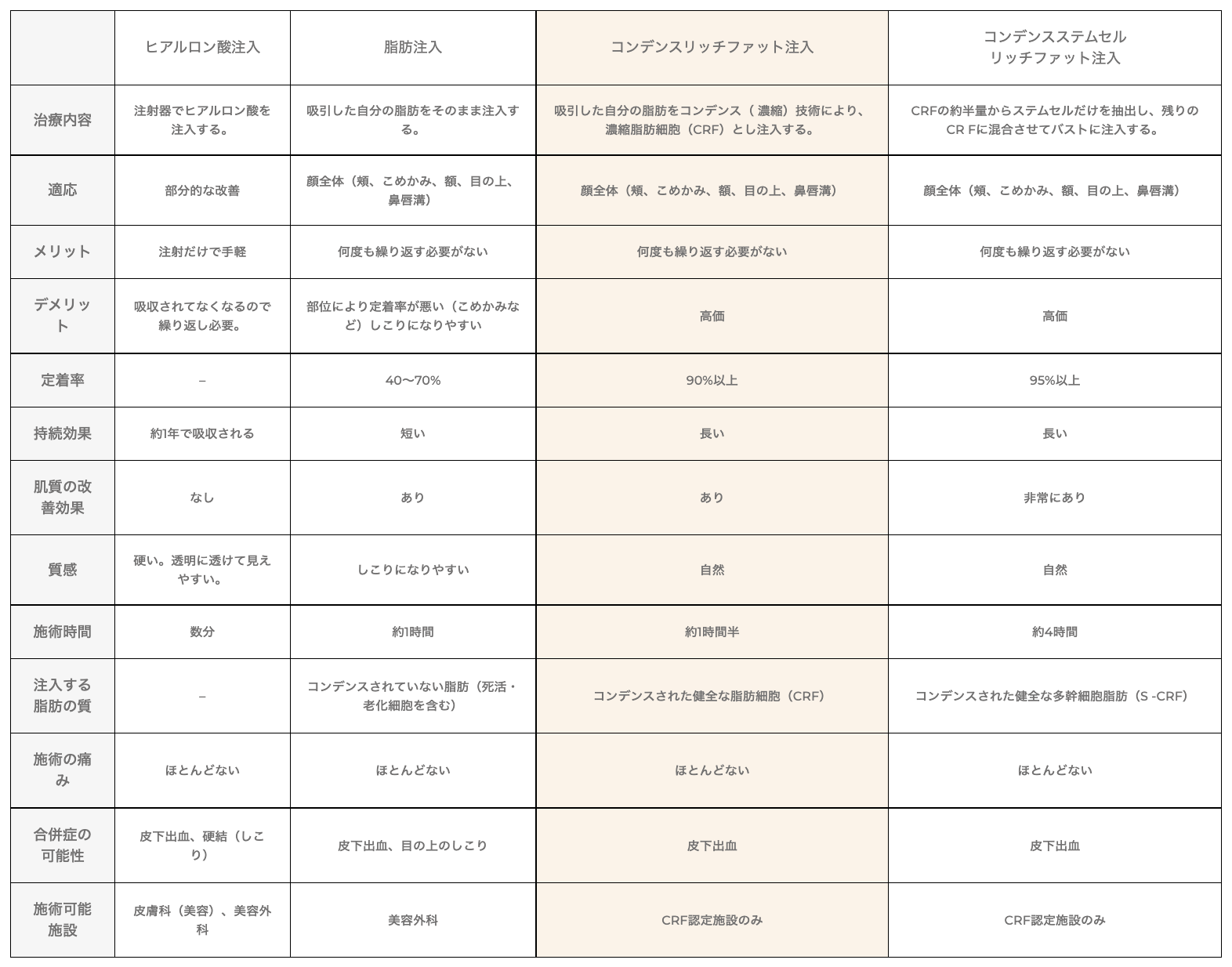 Fat injection has the advantage of less risk of foreign body reactions and a natural feel and appearance compared to the case of inserting an artificial substance into the body.On the other hand, there was also the fact that conventional fat injection involves the risk of necrosis or calcification of the injected fat.On the other hand, condensed rich fat (CRF) injection removes dead and senescent cells that may become necrotic by condensed (concentration) technology and injects only healthy fat under aseptic conditions, thus avoiding the above risks. increase.
