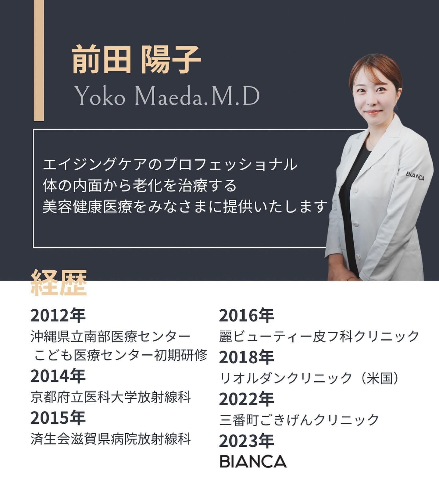 La Clínica Bianca, que también se especializa en tratamientos de medicina estética, cuenta con la Dra. Yoko Maeda como consultora de medicina estética. Los consultores de medicina estética poseen conocimientos y técnicas especializados centrados en el cuidado desde el interior del cuerpo, y desempeñan un papel importante a la hora de realzar la belleza saludable de los pacientes.