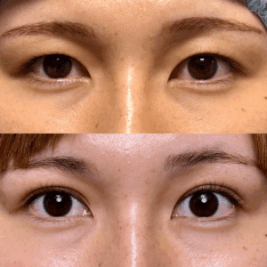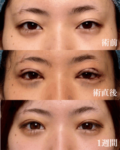 この症例は、全切開+垂れ目形成(グラマラスライン切開)+クマ治療(脱脂術)を同時に行なっていますが、術後1週間でもかなり腫れ感が少ないのがお分かりいただけると思います。