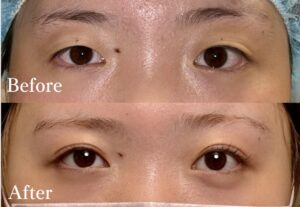 ・目の開きの調整が可能:眼瞼下垂手術を行うことで開きをよくすることができます。実は、幅広い二重幅を全切開のみで行うと目の開きが悪くなることがあります。あらかじめ少し目の開きを良くしておくことで予防できます