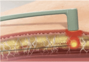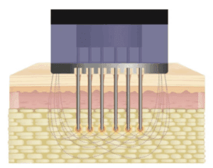 24本の細い針(マイクロニードル)を皮下組織に刺入し、針先から強力なRF(ラジオ波)の熱エネルギーを照射する治療です。