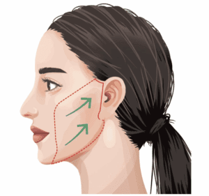 髪の生え際や耳の付け根辺りを切開し、筋膜を引き上げつつ、フェイスラインのたるみを引き上げる治療です。