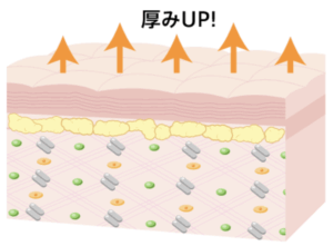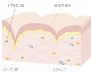 肌のハリ低下、小じわに対して、機械治療や肌育注射を行うと線維芽細胞が刺激され、真皮内のコラーゲンやエラスチンが産生されます。