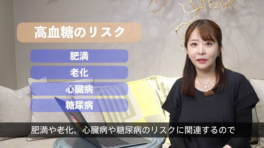血糖値が高いということは、血液中に糖が多い状態です。血糖値が上がると、血管の壁が壊れやすくなる、血管が詰まるなど、さまざまな症状が起こる可能性が。具体的には、肥満や老化、心臓病、糖尿病などのリスクにつながります。
