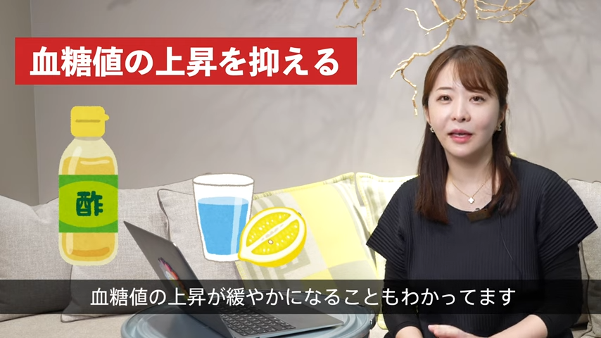 血糖値の上昇をゆるやかにするため、食事の前に酸っぱいお酢やレモンを絞った水を飲んでおくのもおすすめです。食事の内容は同じでも、酢やレモンに含まれるクエン酸により、血糖値を下げる効果が期待できます。