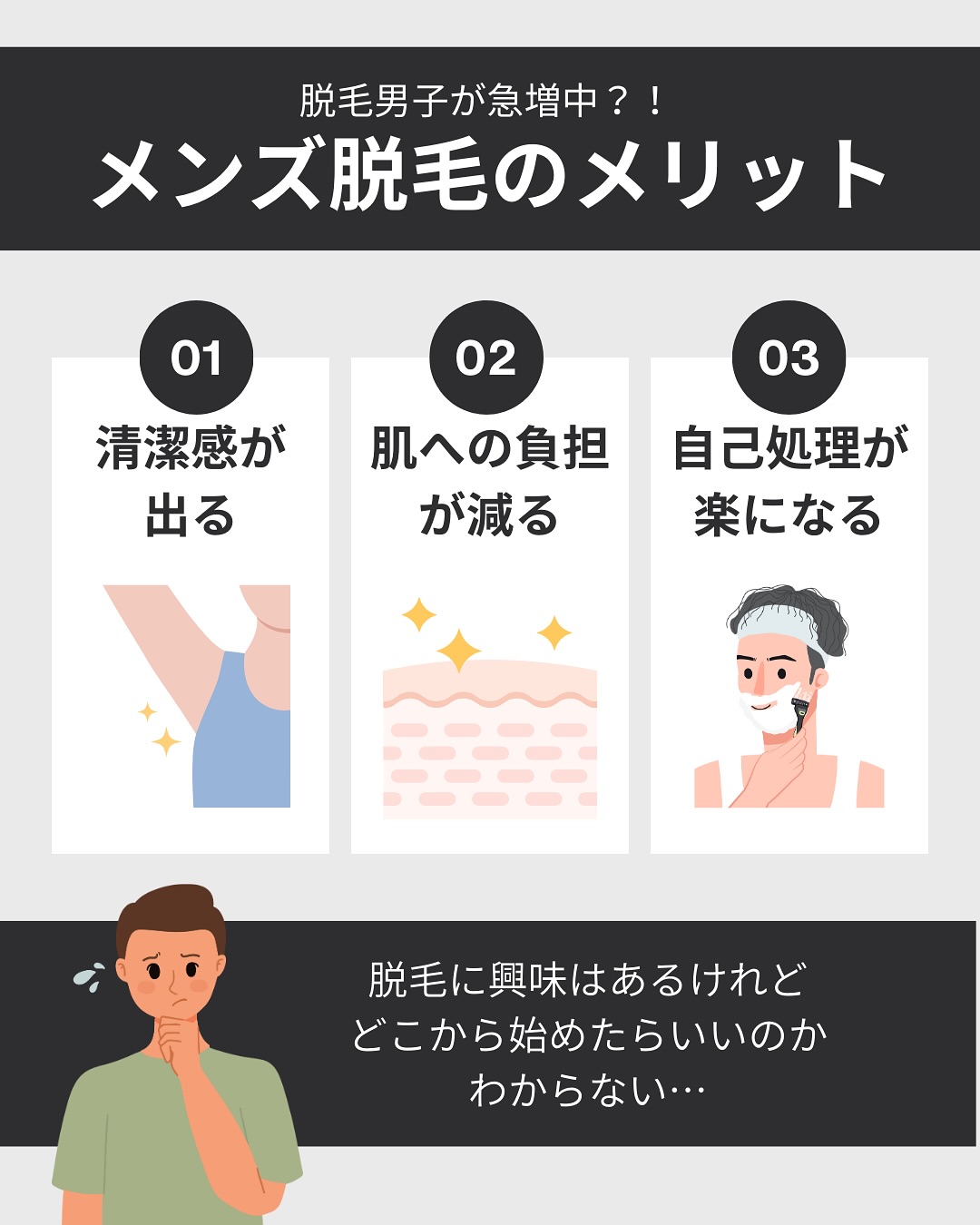 時間がかかる・剃り残しがある・肌が荒れる。これらの悩みから解放されます。