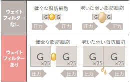 ウェイトフィルターのウェイト(重さ)によって、遠心分離の際に脂肪にかかるG(圧力)は、通常の遠心分離のG(圧力)の約25 倍になります。この時、老いた弱い脂肪細胞はG(圧力)に耐えられず、排泄オイルになります。この約25 倍のG(圧力)に耐えられた強く健全な脂肪細胞(コンデンスリッチファット)のみを抽出し、注入に使用します。