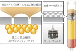 ウェイトフィルターには、液体のみを通す小さな穴が空いており、採取した脂肪から注入には適さない排泄オイル(=トリグリ(死活・老化細胞))を取り除くことができます。従来の脂肪注入法では成し得なかった、不純な排泄オイル(=トリグリ(死活・老化細胞))と新鮮で健全な脂肪との分離が、このフィルターにより実現しました。