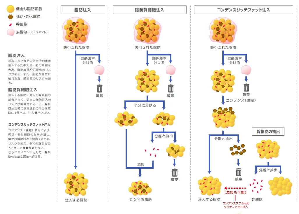 独自のコンデンス( 濃縮)技術で死活・老化細胞を取り除いた濃縮脂肪を、無菌状態で注入。しこりや脂肪壊死が起こりにくくなりました。