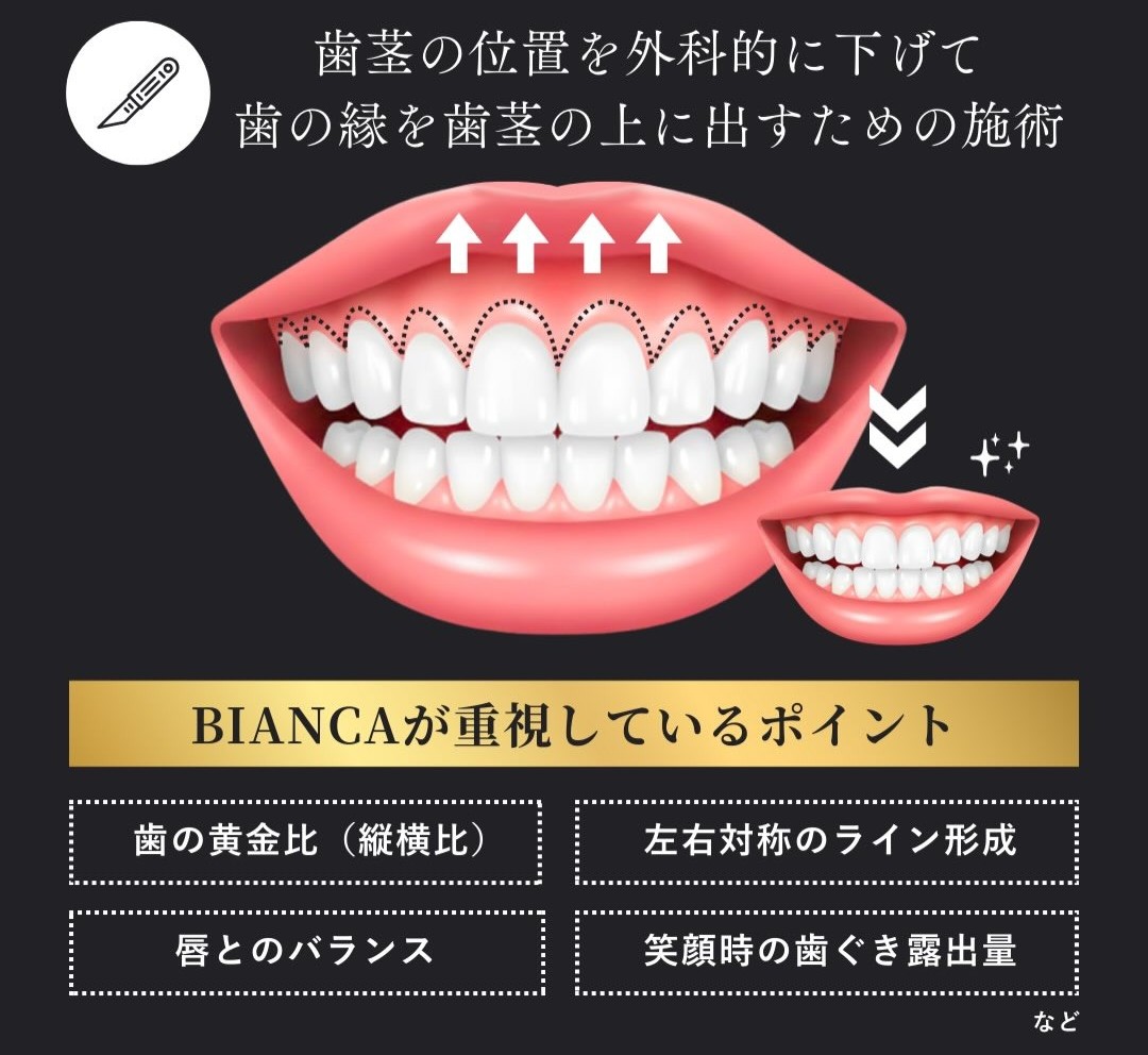 単に歯ぐきを下げるだけではなく、口元全体のバランスを繊細に見極める高度なデザインが求められます。ビアンカクリニックでは、学術的知識と臨床経験を積み重ねてきた歯科医師が施術を担当。