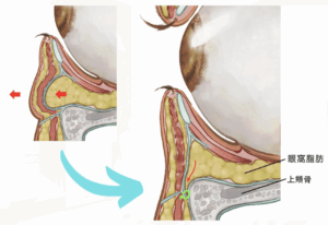 ハムラ法では、突出している眼窩脂肪を切除するのではなく、凹みに向かって移動させて再配置します。