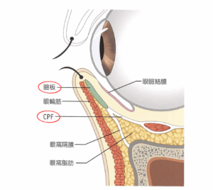 下まぶたの形は、CPF(capsulopalpebral fascia)という組織が瞼板に付着することで保たれています。