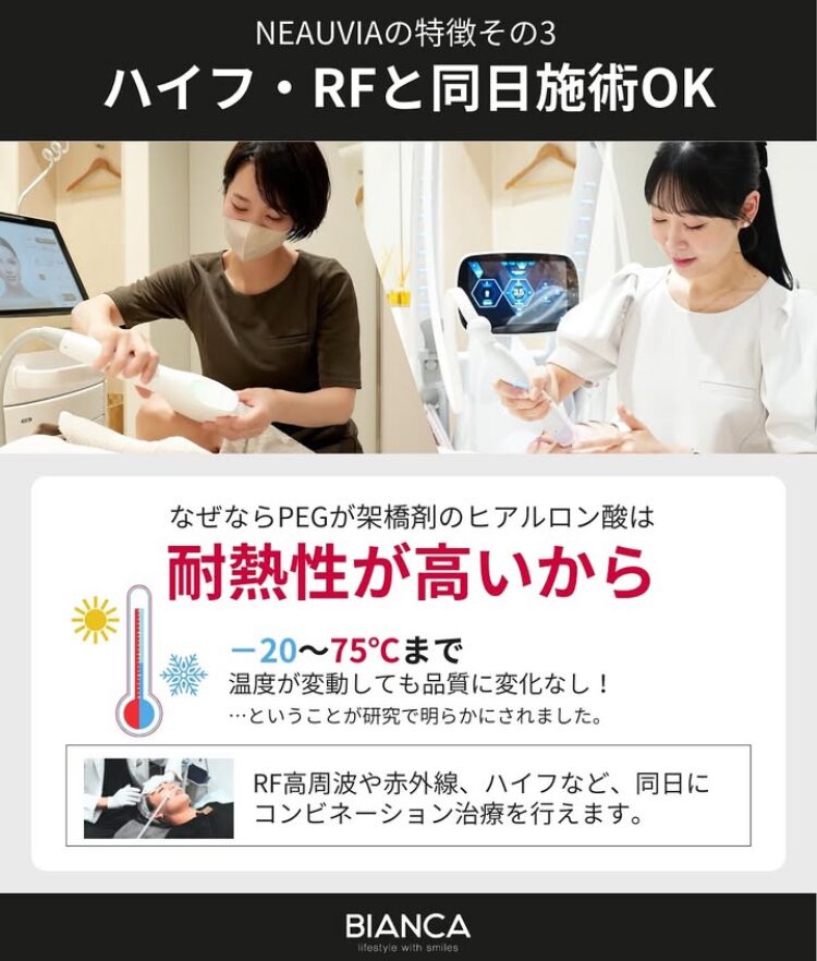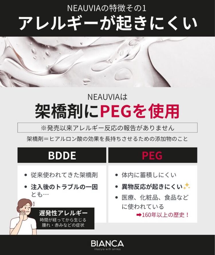 NEAUVIA 中使用的交联剂名为 PEG,与传统的交联剂相比具有更强的内聚力,这意味着即使脸部经常移动,也不会轻易变形💯BIANCA 还根据注射部位提供各种类型的 NEAUVIA!