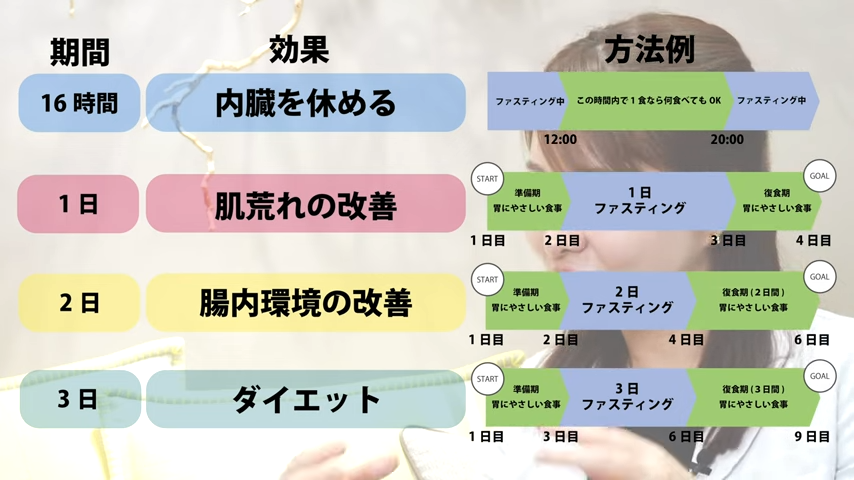 ファスティングには5日間、6日間、7日間と長期間続けるやり方や、半日~1日だけという短期間で行うやり方もあります。期間による効果の違いは以下の通りです。