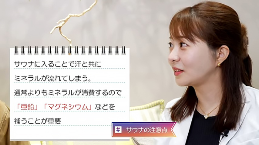 ミネラルは身体に必要な栄養素。たくさん汗をかくサウナでは普段よりもミネラルの消費が激しいので、意識的に「亜鉛」や「マグネシウム」などのミネラルを補給することが大切です。