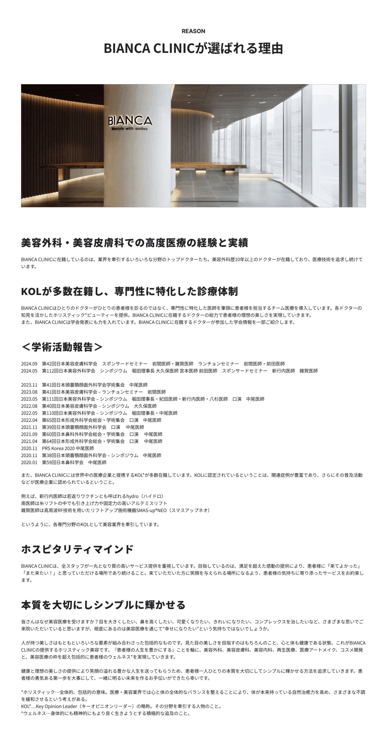 BIANCA CLINIC全体员工团结一致,始终致力于提供高品质服务。我们的目标是通过超越满足感的感动体验,让每位患者都觉得"来这里真是太好了"、"还想再来!",成为值得信赖的医疗场所。我们承诺提供贴心服务,让每位到访者都能绽放笑容。